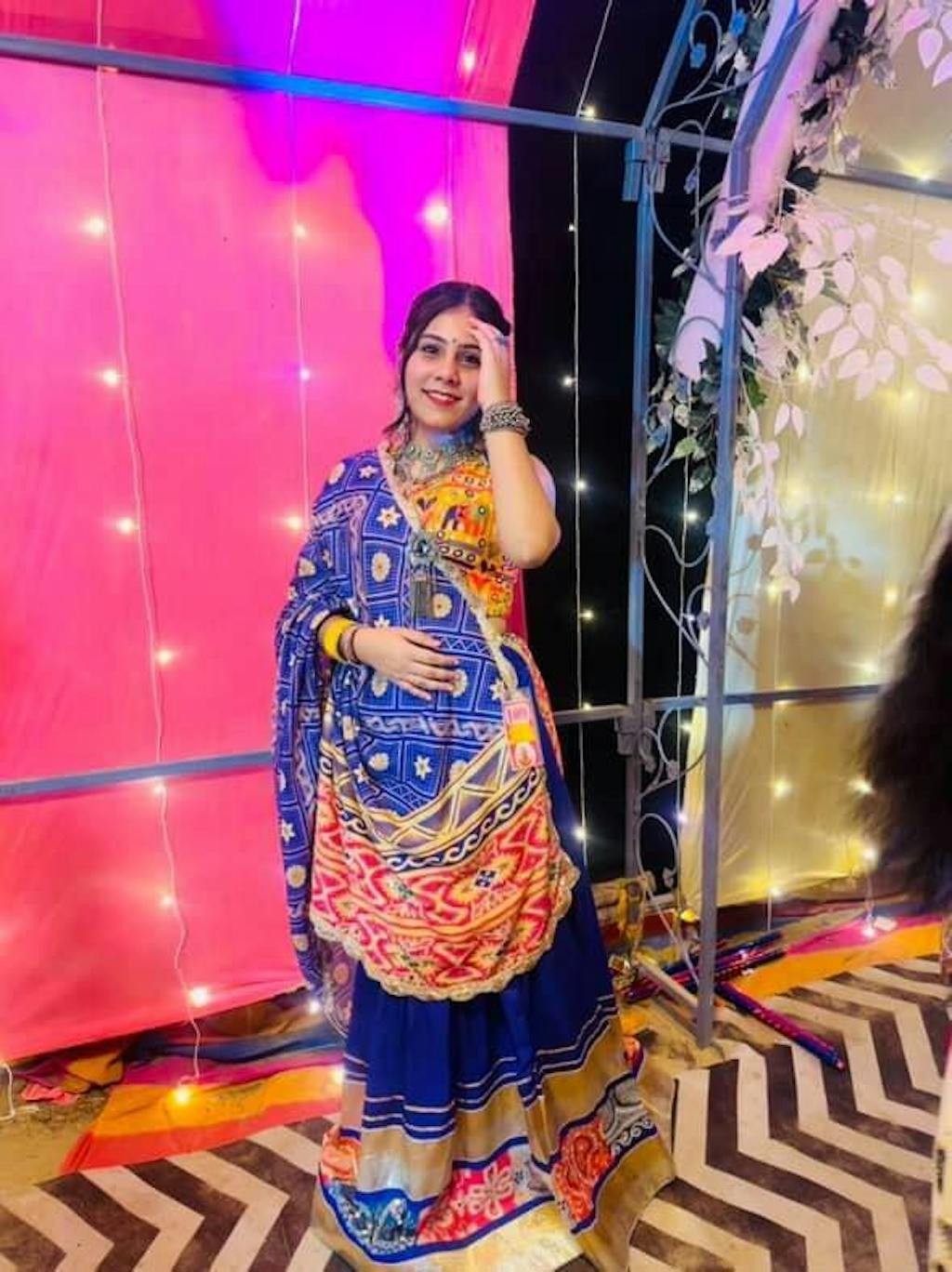 This Aabha Aakar – a perfect harmony of vibrant digital prints, real mirror work, and traditional craftsmanship. Tailored in rich muslin cotton with a beautiful flare, this lehenga choli set brings out the inner diva in every Garba twirl.