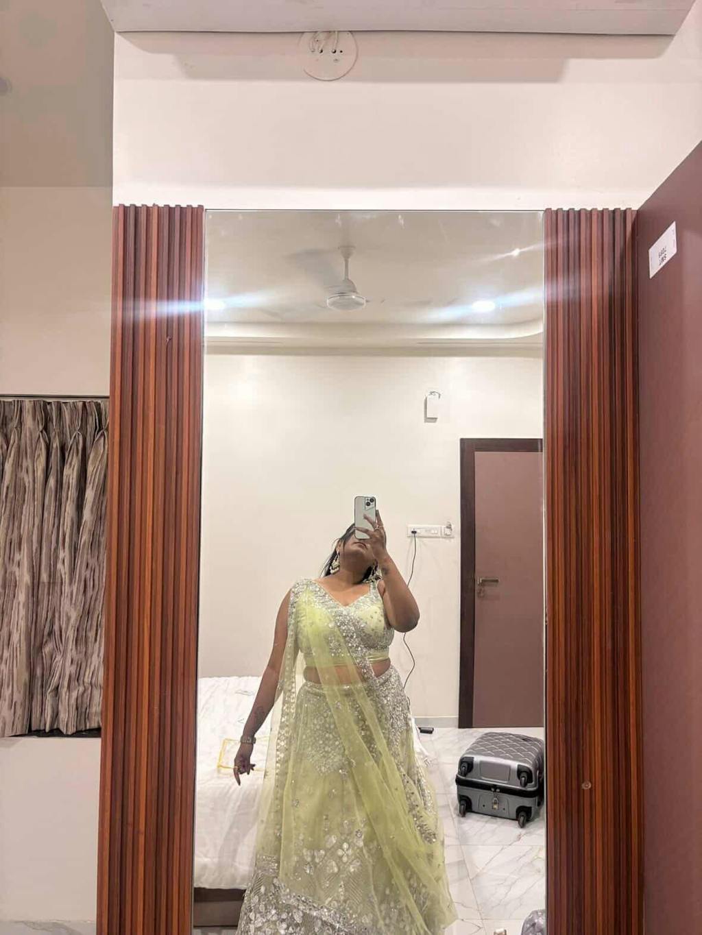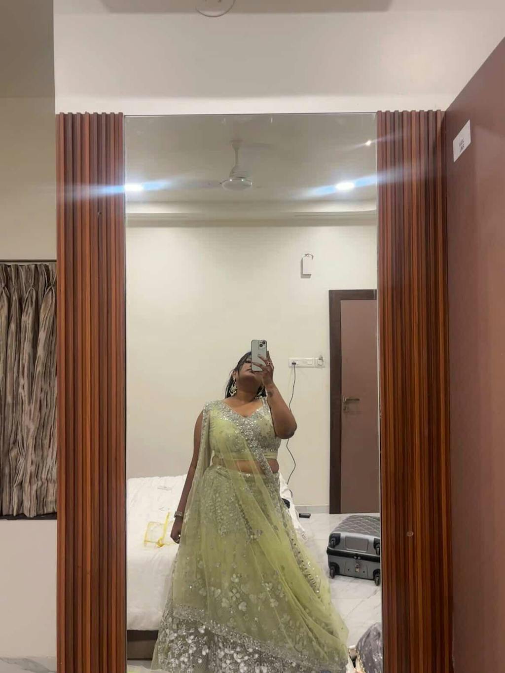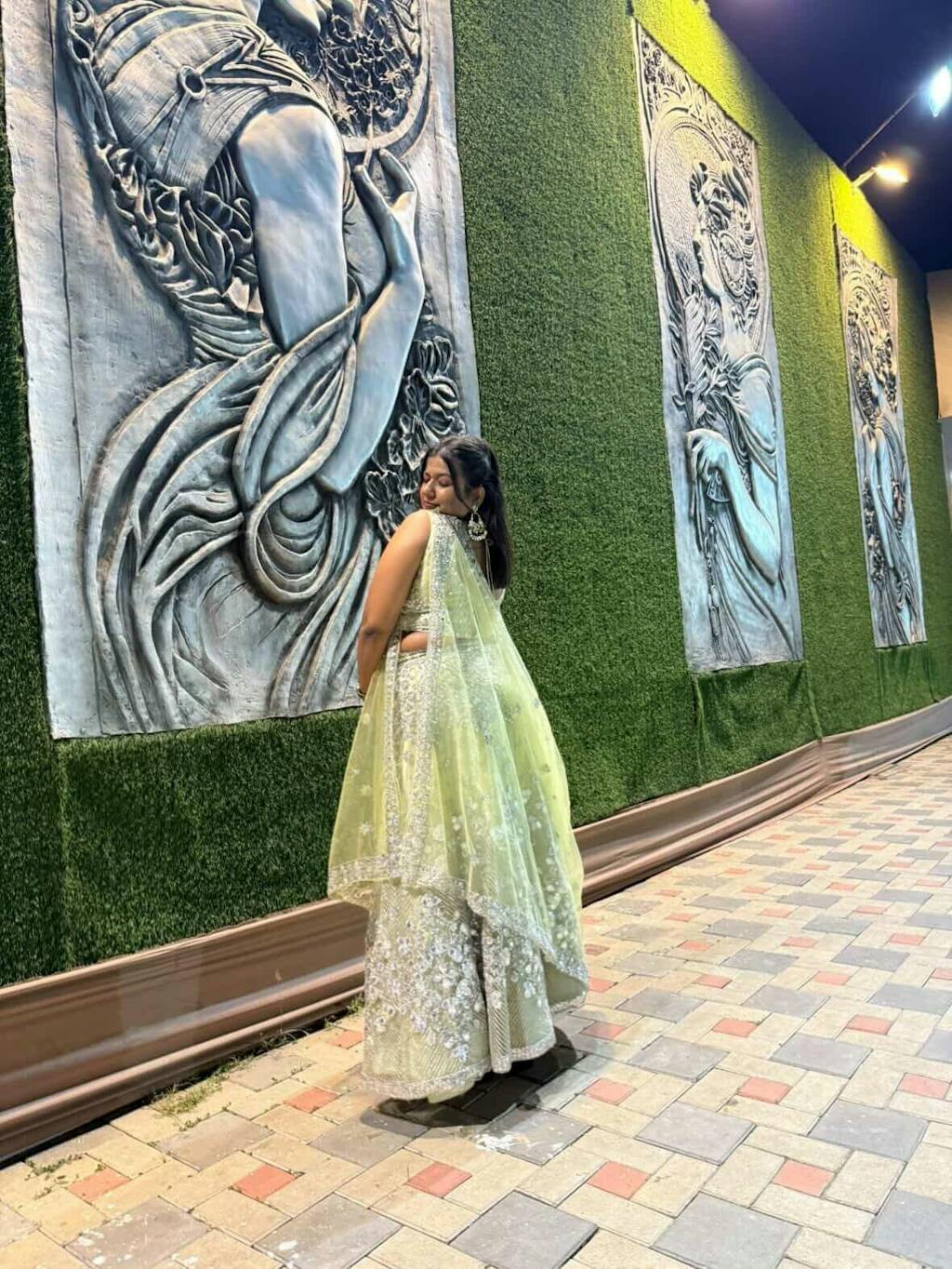 This Mint Glow lehenga is crafted from luxurious butterfly net fabric, known for its lightweight and airy feel. The outfit features an impressive 4-meter flare, creating a voluminous, flowy silhouette perfect for twirling. Intricately embellished with shimmering sequins and delicate embroidery, it exudes a blend of modern elegance and traditional charm, making it an ideal choice for festive occasions or weddings. The soft green hue adds a fresh, vibrant touch, enhancing the overall look with a graceful yet glamorous appeal.