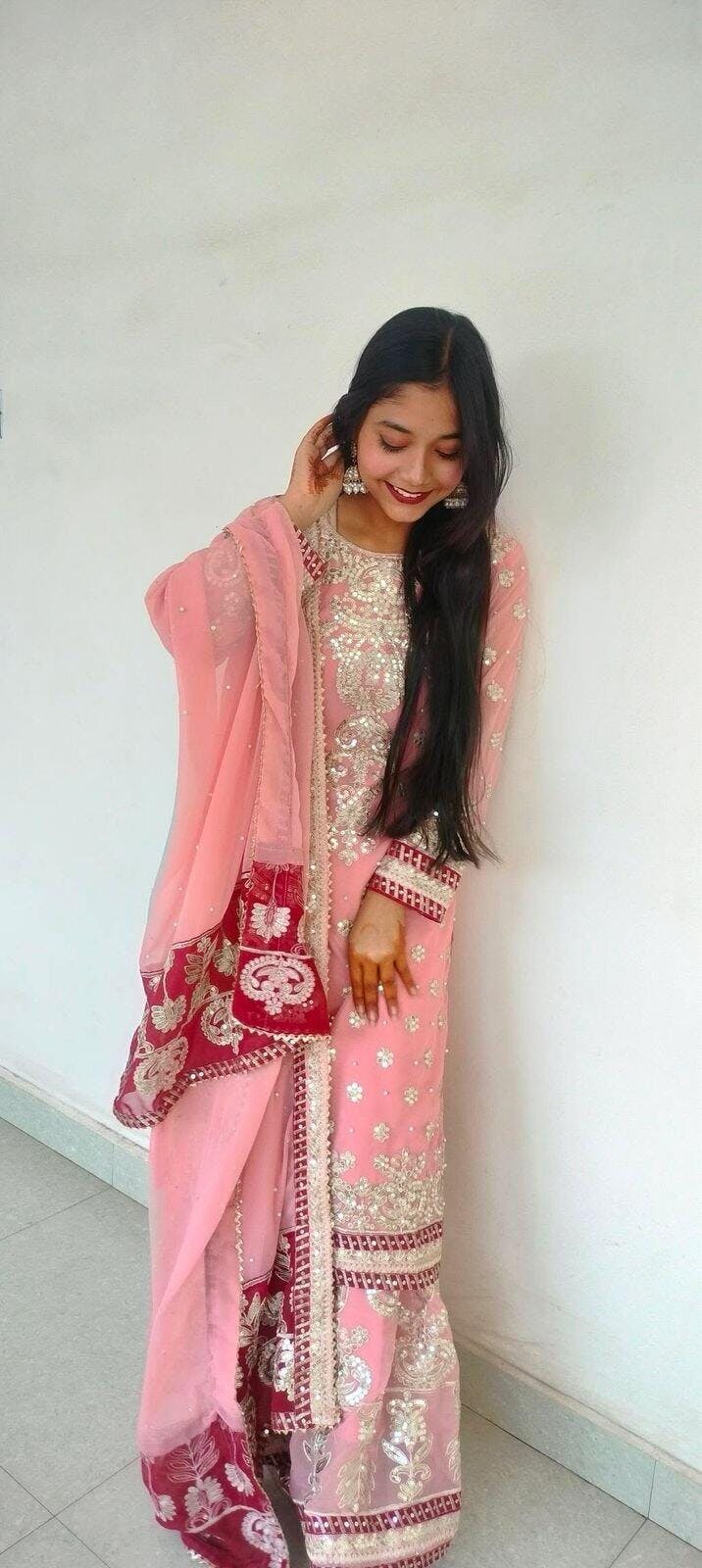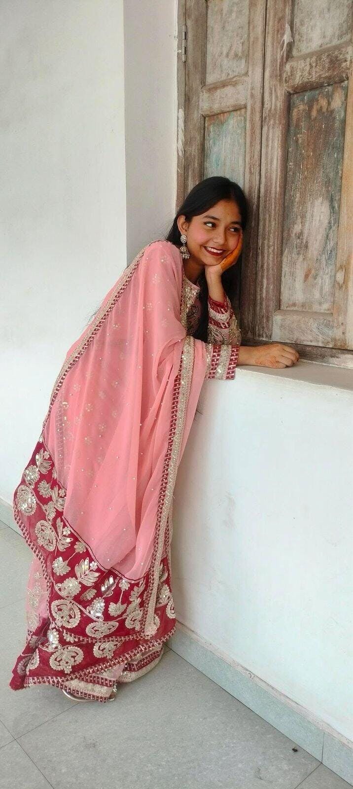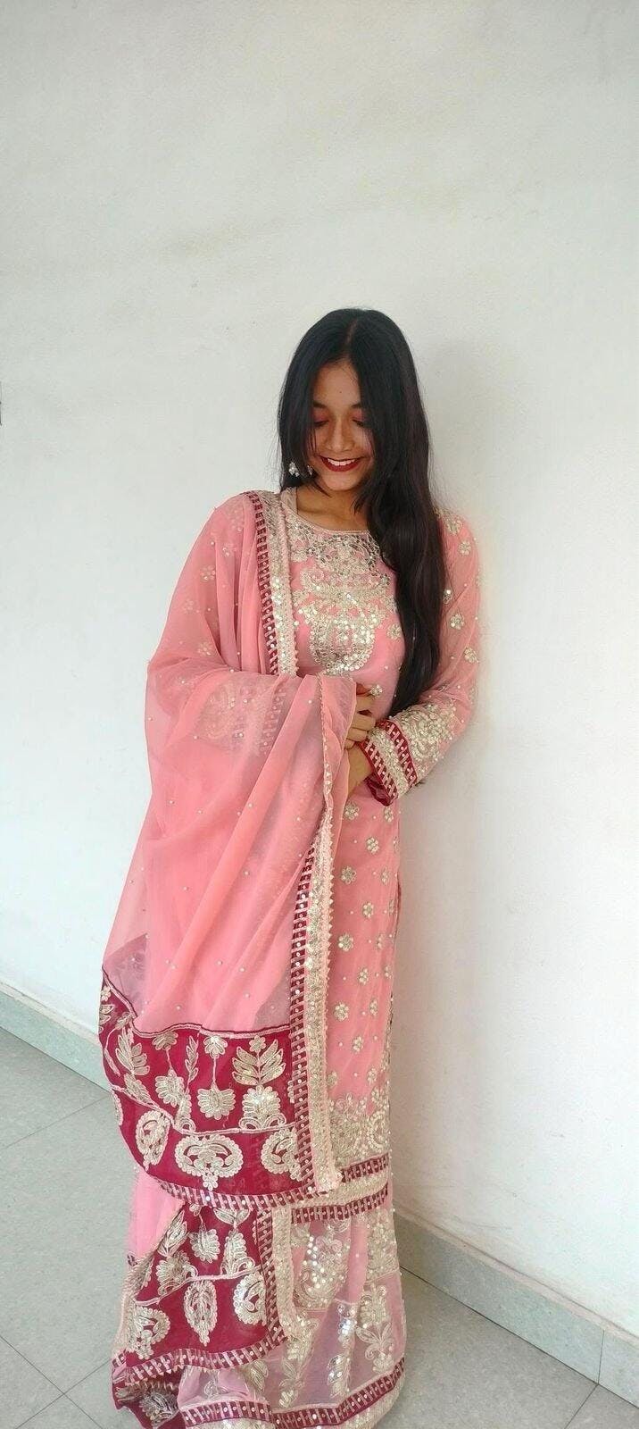 SHARARA : Georgette Fabric With Thread Embroidery With Sequins, Rivet Moti And Fancy Lace Border.